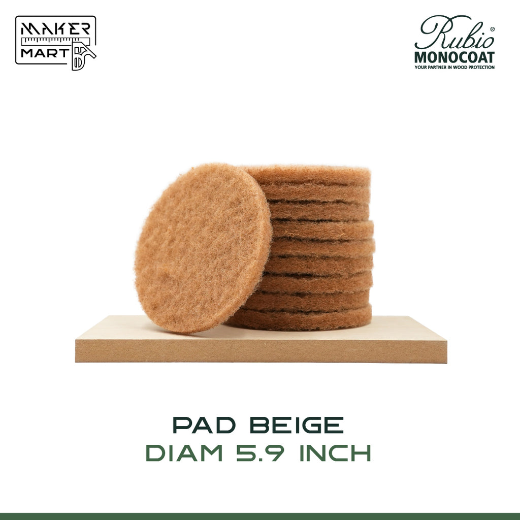 แผ่น Beige Pad ใช้สำหรับขัดเตรียมผิวไม้หรือเกลี่ยน้ำมัน Rubio Monocoat Pre-aging ให้ซึมเข้าสู่เนื้อไม้ได้ลึกขึ้น เหมาะสำหรับการเตรียมผิวก่อนลงน้ำมันและการเก็บผิวหลังลงน้ำมันเพื่อให้ผิวเนียนเรียบ ไม่มีเกล็ดหรือรอย เส้นใยสังเคราะห์ดูดซึมน้อยกว่าผ้า จึงช่วยลดการสิ้นเปลืองน้ำมัน
